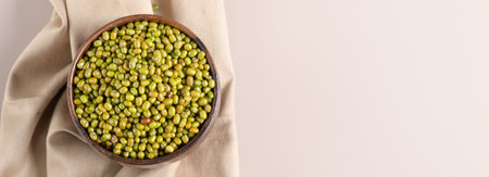 Green mung beans in wooden scoop on cotton napkin, close up. Healthy plant-based protein, healthy cooking ingredient for vegan recipes and vegetarian diets