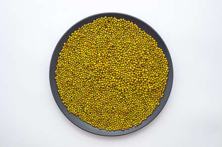 Mung beans or yellow bean isolated on black background, Thai call gold beans side, top view.