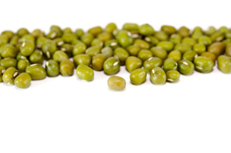 Group of green mung beans on white background. Copy space, selective focus