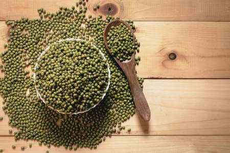 Healthy superfood. Uncooked green mung beans in wooden spoon over wooden background. Top view
