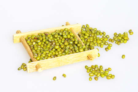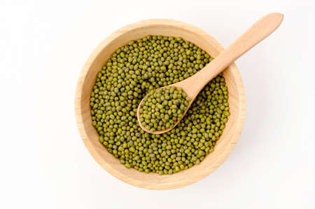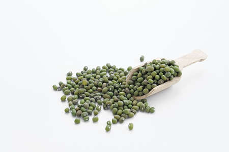 mung bean in bowl and wood spoon on white background studio shot