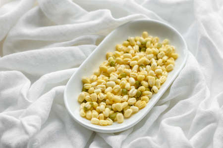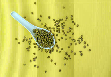 Dried mung into porcelain chinese soup spoon on the striped yellow background.