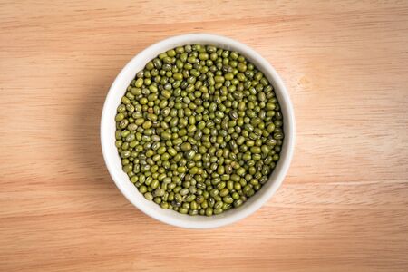 Close up of raw mung bean in a bowl on wooden table background.