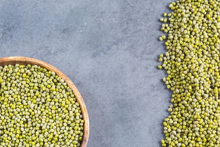 Top view of raw mung bean in a bowl on wooden table background.