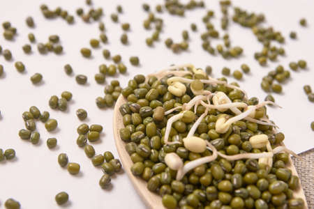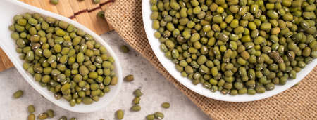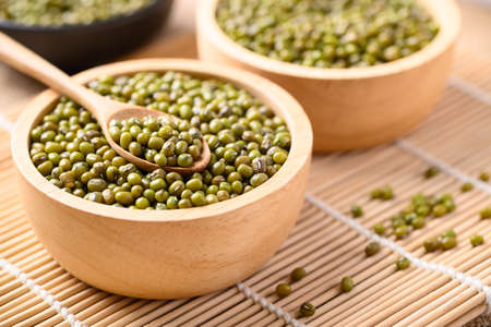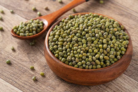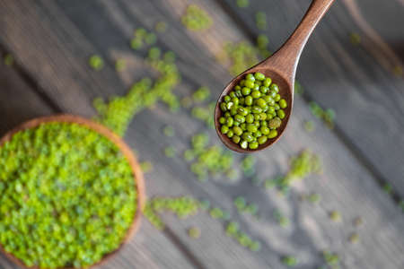 Mung bean seeds in a wooden spoon and bowl, Food ingredients in Asian cuisine and produce mung bean sprout