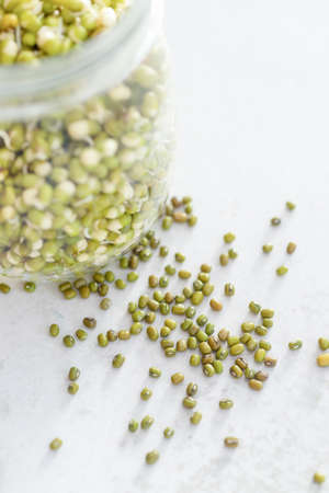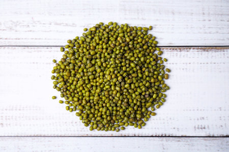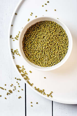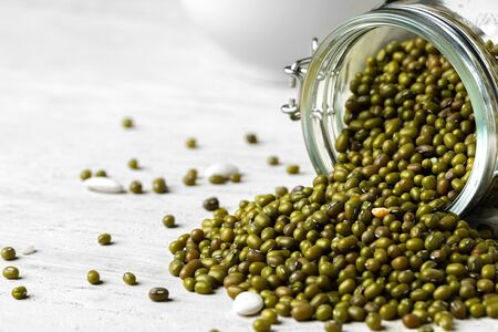 Mung Bean Bean on white wooden textured table, food background with copy space