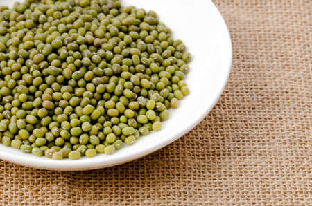 mung bean in a white plate on burlap background