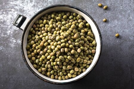 Dry organic green mung bean background after harvested. For clean food ingredient and agricultural product concept