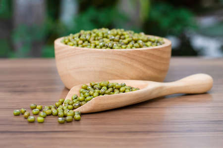 Green mung beans in wooden bowl and scoop isolated on wood table with green nature background. Selective focus.