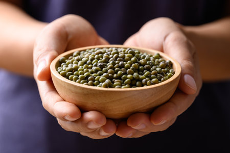 Green mung bean in wooden bowl holding by hand, Food ingredients