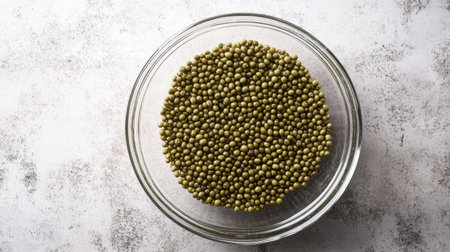 An artistic overhead view of green mung beans in a decorative bowl, showcasing the vibrant colors and textures, perfect for food styling and healthy cooking.