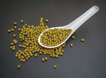 Dryed mung into porcelain chinese soup spoon on the dark gray table.