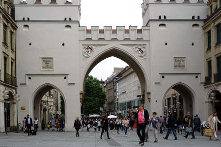 Munich, Germany - June 30, 2018: Tourists and pedestrians walking through the Karlstor for shopping at the city center and Munich's old town on June 30, 2018 in Munich.