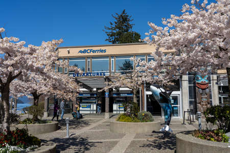 West Vancouver, BC, Canada - April 13 2021 : BC Ferries Horseshoe Bay Ferry Terminal. Cherry blossoms full bloom in springtime.
