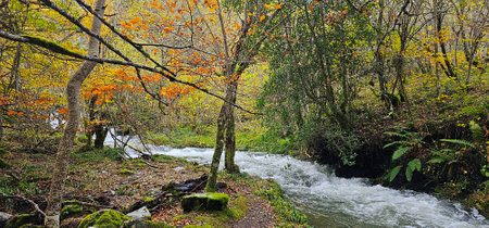 Autumn forest with a small river flowing through it in Catalonia, Spain