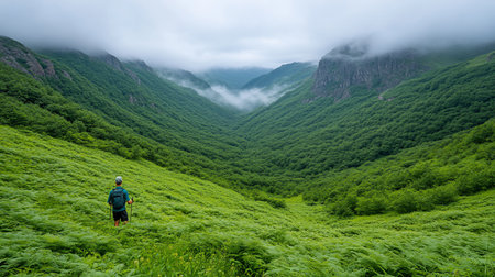 A lone hiker with a backpack and trekking poles navigates a vibrant green fern-covered valley, surrounded by steep, mist-shrouded mountains on an overcast day.
