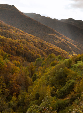 Picturesque autumn view of river winding through Asturias mountains, with golden vegetation in foreground, pine trees, rolling green hills and layered peaks under cloudy sky