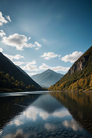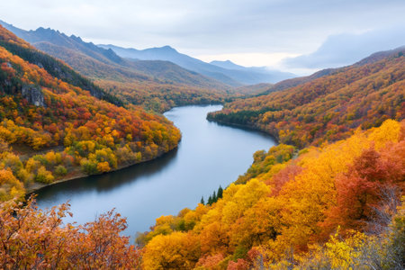 Stunning landscape showcasing vibrant fall colors along a picturesque river flowing through a mountain valley
