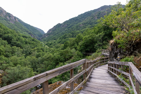 The image showcases a high-angle, long shot of a wooden pathway with railings, ascending slightly. The pathway leads the viewer's eye into a deep, verdant gorge or valley.