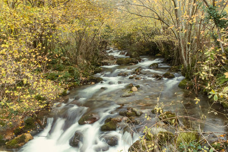 Stream of water running down a river between the rocks in an autumnal forest with trees with yellow leaves in Asturias in northern Spain. Relating to nature, the environment and hiking.