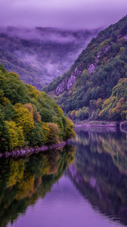 Scenic view of a reflective lake amidst lush, colorful hills shrouded in misty fog