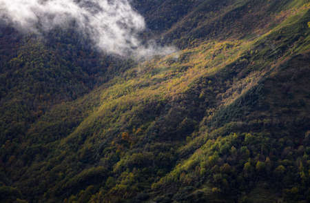Shreds of fog rises from a humid forest in the heat of sun rays, in Courel Mountain Geopark