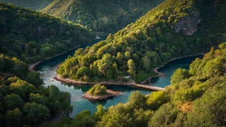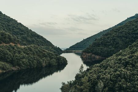 Aerial view of calm river meandering through lush green mountains in Asturias, with pine trees on slopes and rugged rocky shoreline under soft daylight