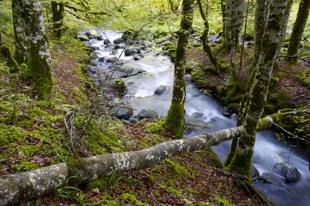 The water from a mountain river flows between the mossy rocks. Magical landscape of a forest in nature. Relating to trips, trekking and hiking in Asturias