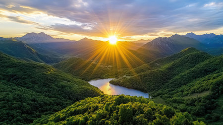 A Breathtaking sunset over mountains and serene lake, showcasing nature beauty
