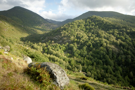 Late evening light over the forests in the valley of San Román de Cervantes