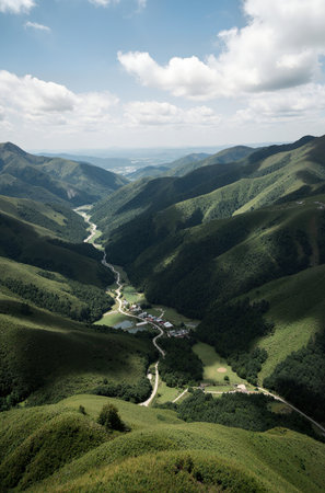 A breathtaking view reveals a deep valley enveloped by towering mountains, with a serene river flowing through dense forests under a dramatic sky.