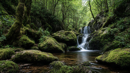 Waterfall in the forest with mossy rocks and lush greenery