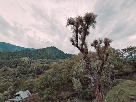 Kashmir beauty green hills forests in mountains. summer landscape with green grass on the hills. nature scenery on a sunny day with clouds on the sky