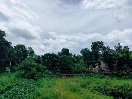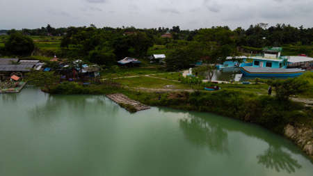 airview Landscape with green fields, scattered buildings, and dense foliage under hazy sky. Bangladesh, Rajshahi