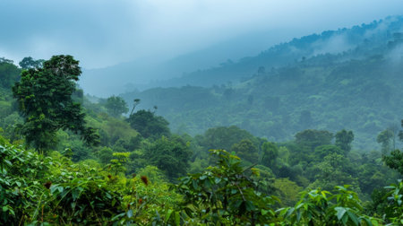 Earth Day Environment concept With tropical forest and fertile forest with fog as a backdrop . concept of reducing carbon emissions protect the environment Sustainable restoration