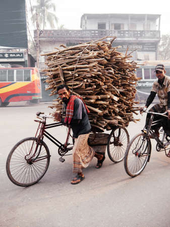 FEB 17, 2012 Dhaka, Bangladesh - Bangladesh worker people carrying a lot of wood on small bicycle on dusty street of Dhaka city
