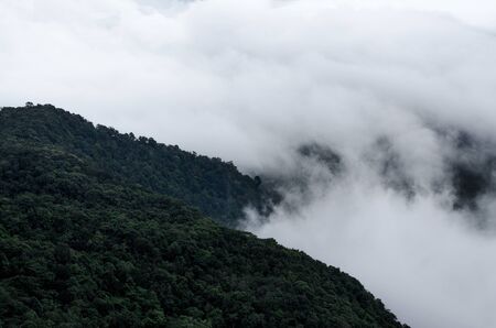 The space for text In the fog and clouds, a panoramic view of the Thai mountains.