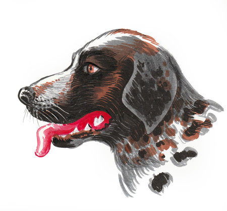 Hunting dog head. Ink and watercolor drawing