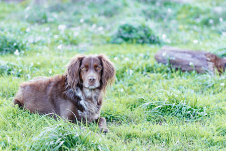 Russian brown spaniel lying in green grass in a field and lit by the setting sun.
