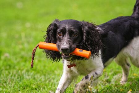 Spaniel runs after the toy on the grass