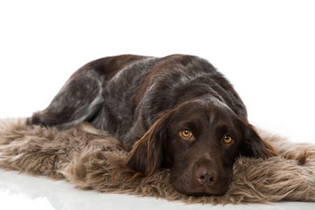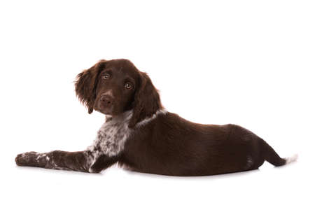 Small munsterlander puppy lying isolated on white