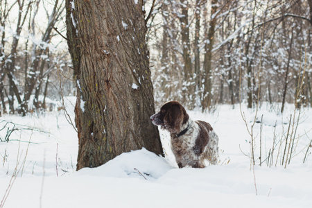 Brown dog cocker spaniel standing in the snow
