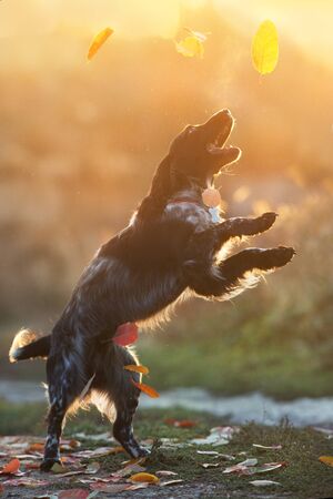 Spaniel hunting for a walk in the fall. Dog on a walk in autumn. Autumn portrait of an animal. Puppy. Walking a pet. Beautiful photo with a dog. Article about Pets. Black and white color. Autumn.