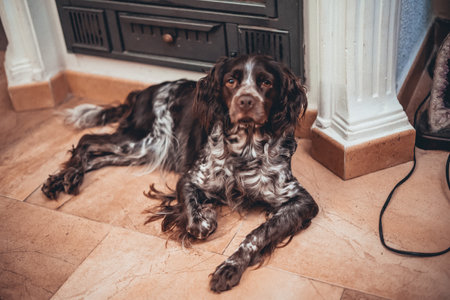 Sad Dog breed English Springer Spaniel is lying down on the floor and waiting for his family, the owner home. A sad pet is alone at home, lying and waiting for the return of his friends. Stay at home.