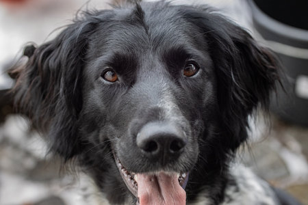 Closeup portrait of beautiful black spaniel dog. Focus on eyes. The big dog wants to find family and leave the dog shelter, waiting for the hosts.
