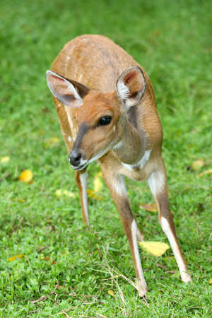 Portrait of little cute deer on green grass lawn in Nakhon Ratchasima or Korat zoo, Thailand.