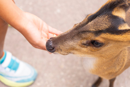 Little girl feeding a little fawn in the park, Thailand.