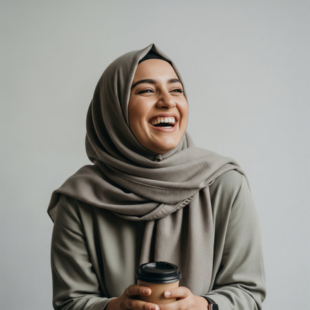 Cheerful young Asian Muslim woman in hijab surrounded by happiness