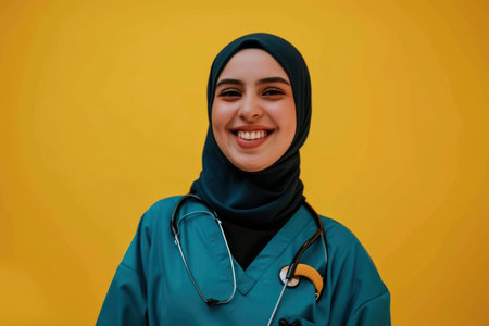 Portrait of beautiful muslim woman wearing hijab with yellow flower background