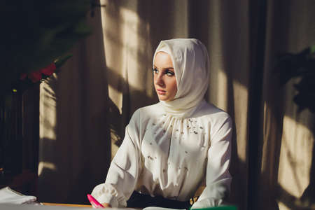 beautiful arabian muslim woman wearing white hijab